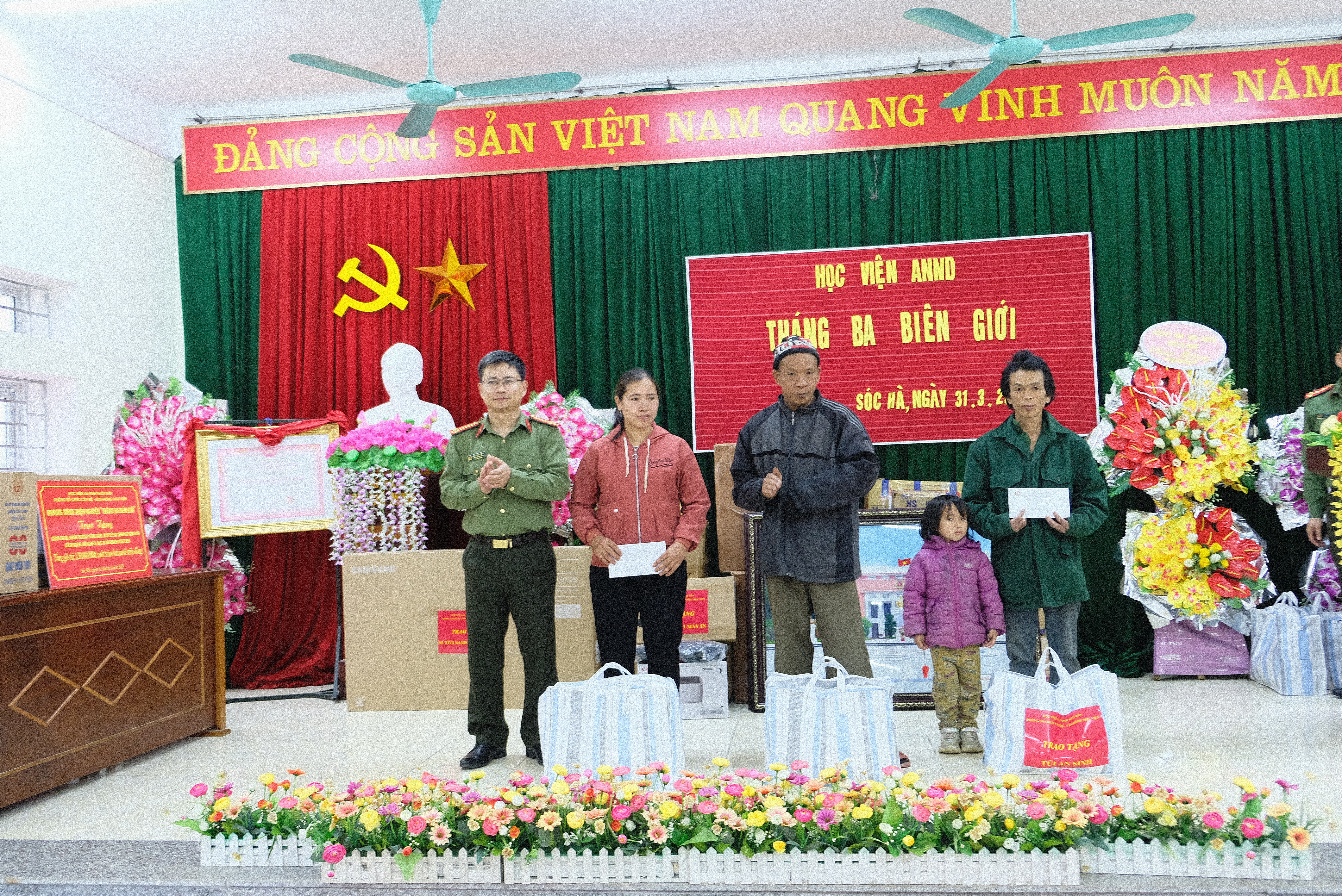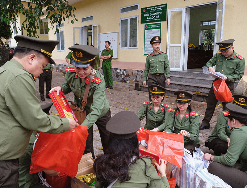 Nhân dịp này, đại diện cho Đoàn công tác, Đại tá Chu Quang Thiện cùng lãnh đạo hai đơn vị đã trao tặng quà lưu niệm cho UBND xã Sóc Hà, trao quà cho Công an xã Sóc Hà, phân trường Lũng Củm, các gia đình có công với cách mạng, các hộ nghèo và học sinh nghèo vượt khó trên địa bàn xã Sóc Hà gồm: 01 tivi, 03 laptop, 02 máy in, 01 sân chơi thiếu nhi, các phần quà (gồm: túi an sinh và 01 triệu đồng tiền mặt), cùng nhiều phần quà khác với tổng giá trị là 120 triệu đồng.