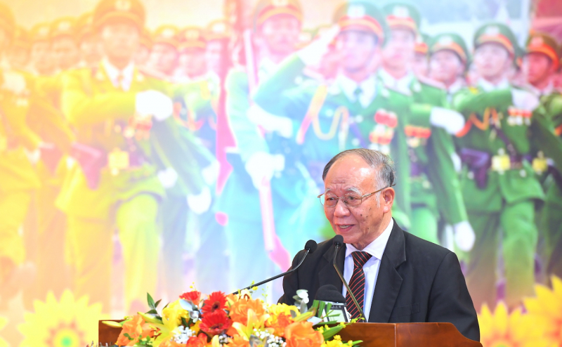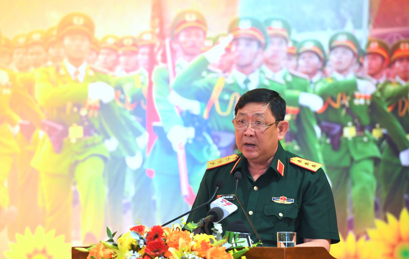 Thượng tướng Huỳnh Chiến Thắng trình bày tham luận tại hội thảo.