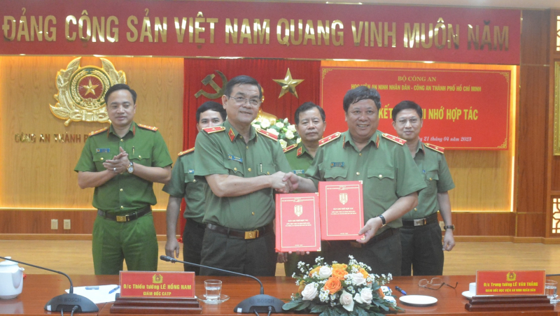 Thiếu tướng, TS Lê Hồng Nam, Giám đốc Công an TP Hồ Chí Minh và Trung tướng, PGS.TS Lê Văn Thắng, Giám đốc Học viện ANND, ký kết Bản ghi nhớ hợp tác giữa hai đơn vị.