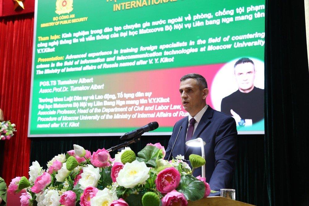 PGS.TS Tumakov Albert, Trưởng Khoa Luật dân sự và Lao động, Tố tụng dân sự Đại học Matxcova Bộ Nội vụ Liên bang Nga mang tên V.Y. Kikot đã chia sẻ những kinh nghiệm trong đào tạo chuyên gia nước ngoài về phòng chống tội phạm công nghệ thông tin và viễn thông.