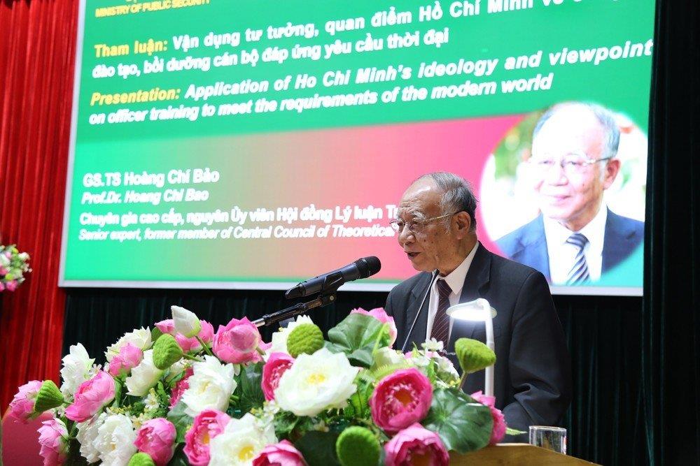 GS.TS Hoàng Chí Bảo, chuyên gia cao cấp, nguyên Ủy viên Hội đồng Lý luận Trung ương cũng đã chia sẻ kinh nghiệm vận dụng tư tưởng Hồ Chí Minh trong đào tạo, bồi dưỡng cán bộ chiến lược nói chung, lực lượng vũ trang nói riêng đáp ứng yêu cầu thời đại. GS.TS Hoàng Chí Bảo nhấn mạnh, các cơ sở đào tạo trong Công an nhân dân cần bám sát Sáu điều Bác Hồ dạy Công an nhân dân; chú trọng phương pháp đào tạo, gắn học với hành, sẵn sàng tâm thế của công dân toàn cầu, tăng cường hợp tác với nhiều bạn bè quốc tế.