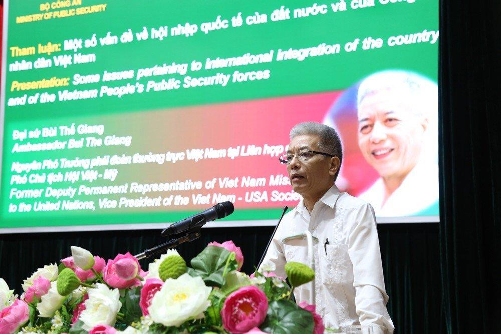 Đại sứ Bùi Thế Giang, nguyên Phó Trưởng phái đoàn thường trực Việt Nam tại Liên Hợp Quốc, Phó Chủ tịch Hội Việt-Mỹ cũng đã đánh giá cao những nỗ lực, đóng góp của lực lượng Công an nhân dân nói chung, lực lượng CSND nói riêng trong hội nhập quốc tế thời gian qua như tham gia lực lượng gìn giữ hòa bình của Liên Hợp Quốc; tham gia công tác cứu hộ, cứu nạn tại Thổ Nhĩ Kỳ. Đồng thời, Đại sứ bày tỏ mong muốn lực lượng Công an nhân dân cần tiếp tục quan tâm nâng cao chất lượng đào tạo, bồi dưỡng sĩ quan Cảnh sát làm việc trong môi trường quốc tế để đáp ứng tốt yêu cầu, nhiệm vụ trong tình hình mới.