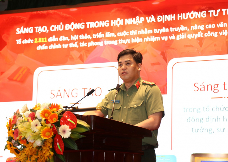 Trung tá Đồng Đức Vũ, Trưởng Ban Thanh niên CAND trình bày báo cáo tại hội nghị.