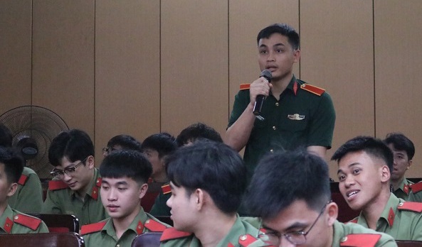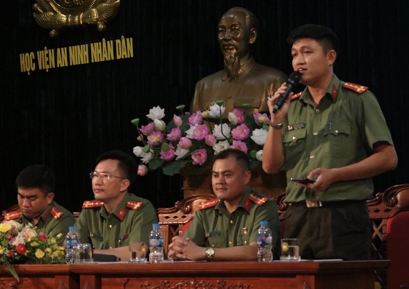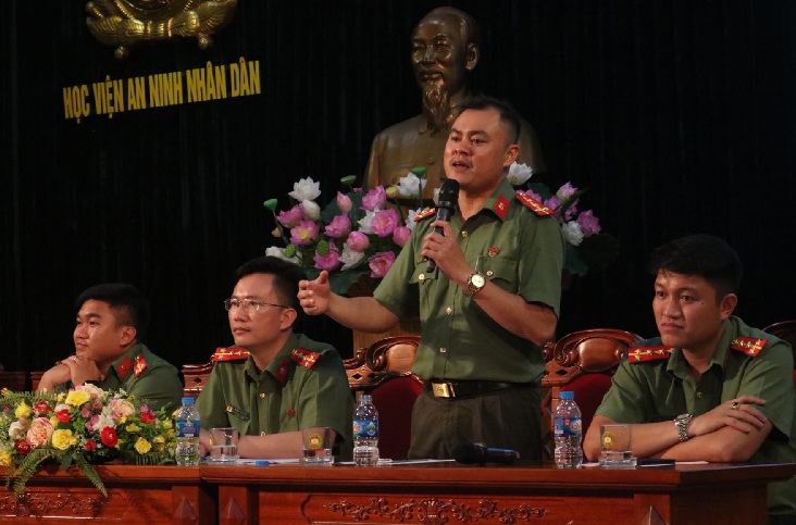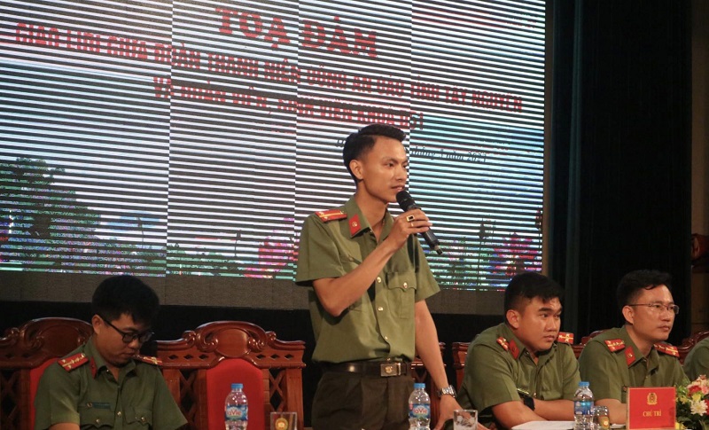 Đại uý Trần Văn Hiểu - Uỷ viên Ban Chấp hành Trung ương Đoàn, Bí thư Đoàn Thanh niên Học viện ANND phát biểu tại Tọa đàm.