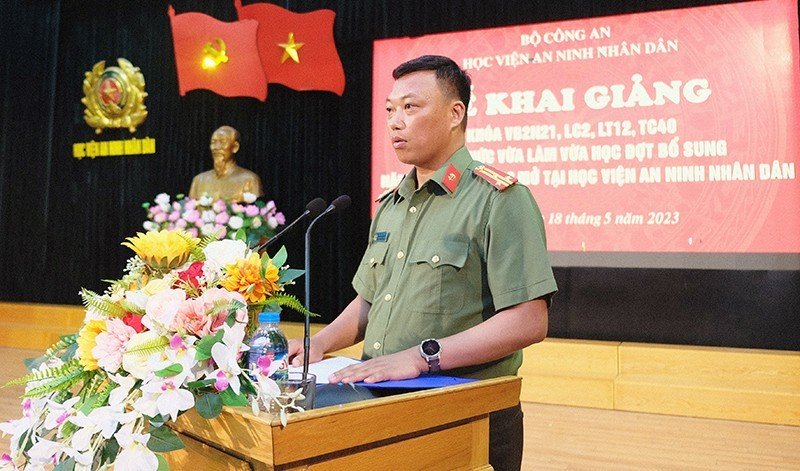 Trong diễn văn buỗi Lễ, thay mặt Đảng ủy, Ban Giám đốc Học viện ANND, Thiếu tướng, TS Trần Kim Hải - Phó Giám đốc Học viện chúc mừng 242 học viên là cán bộ, chiến sĩ đang công tác tại 45 Công an đơn vị, địa phương đã trúng tuyển đợt bổ sung năm học 2022 - 2023 vào các khóa đào tạo trình độ đại học hình thức vừa làm vừa học, gồm VB2N21, LT12, LC2- VLVH, TC40. Đồng chí Phó Giám đốc nhấn mạnh, học viên các khóa đợt tuyển sinh bổ sung được đào tạo theo chương trình đại học ngành Trinh sát an ninh và Điều tra hình sự với thời gian là 2,5 năm đối với Khoá VB2N21; 03 năm đối với Khóa LT12-VLVH; 1,5 năm đối với Khóa LC2-VLVH; 4,5 năm đối với Khóa TC40.