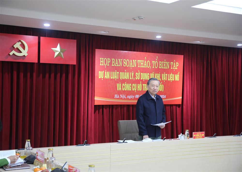 Ngày 09/01/2024, tại Hà Nội, Bộ Công an tổ chức họp Ban Soạn thảo, Tổ Biên tập Dự án Luật Quản lý, sử dụng vũ khí, vật liệu nổ và công cụ hỗ trợ (sửa đổi). Đại tướng Tô Lâm, Uỷ viên Bộ Chính trị...