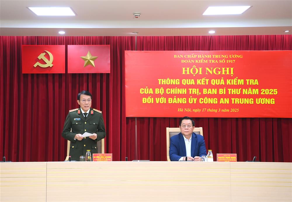 Ngày 17/3/2025, tại Hà Nội, Đoàn kiểm tra số 1917 của Bộ Chính trị, Ban Bí thư năm 2025 tổ chức Hội nghị thông qua kết quả kiểm tra đối với Đảng ủy Công an Trung ương (CATW).