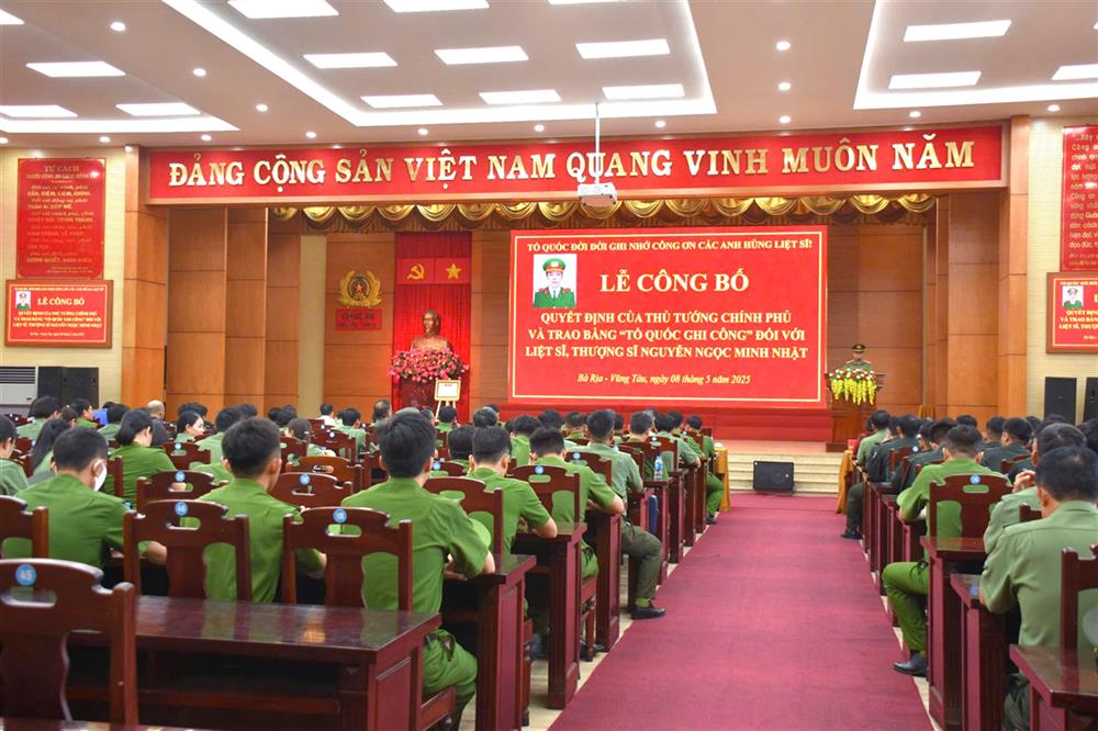 Ngày 08/5/2025, Công an tỉnh Bà Rịa – Vũng Tàu trang trọng tổ chức Lễ công bố Quyết định của Thủ tướng Chính phủ và trao Bằng Tổ quốc ghi công cho thân nhân Liệt sĩ, Thượng sĩ Nguyễn Ngọc Minh Nhật, c...