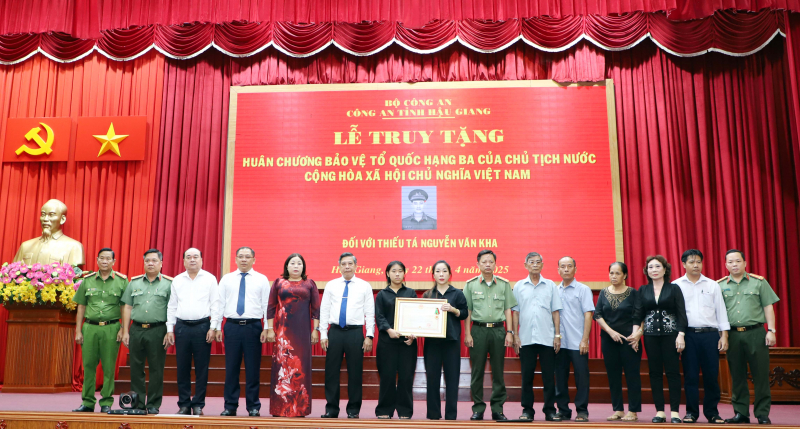 Chiều 22/4, Công an tỉnh Hậu Giang đã tổ chức Lễ truy tặng Huân chương Bảo vệ Tổ quốc hạng Ba đối với Thiếu tá Nguyễn Văn Kha, cán bộ Công an xã Vĩnh Tường (huyện Vị Thủy, tỉnh Hậu Giang) vì đã có thà...