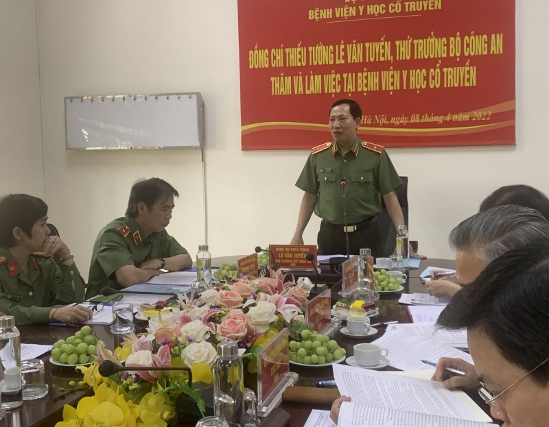 Sáng 8/4 tại Hà Nội, Thiếu tướng Lê Văn Tuyến, Thứ trưởng Bộ Công an chủ trì buổi làm việc với lãnh đạo chủ chốt Bệnh viện Y học cổ truyền Bộ Công an. Tham dự buổi làm việc có đại diện lãnh đạo Văn ph...