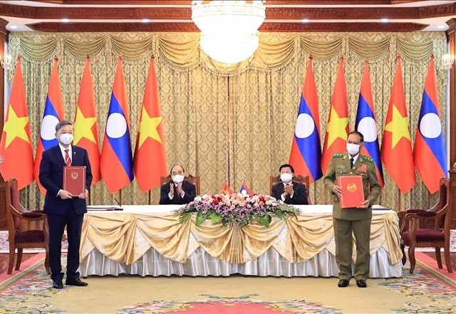 Nhân chuyến thăm hữu nghị chính thức nước Cộng hòa Dân chủ Nhân dân Lào của Chủ tịch nước Nguyễn Xuân Phúc, ngày 09/8/2021, tại Thủ đô Vientiane, trước sự chứng kiến của Chủ tịch nước Nguyễn Xuân Ph...
