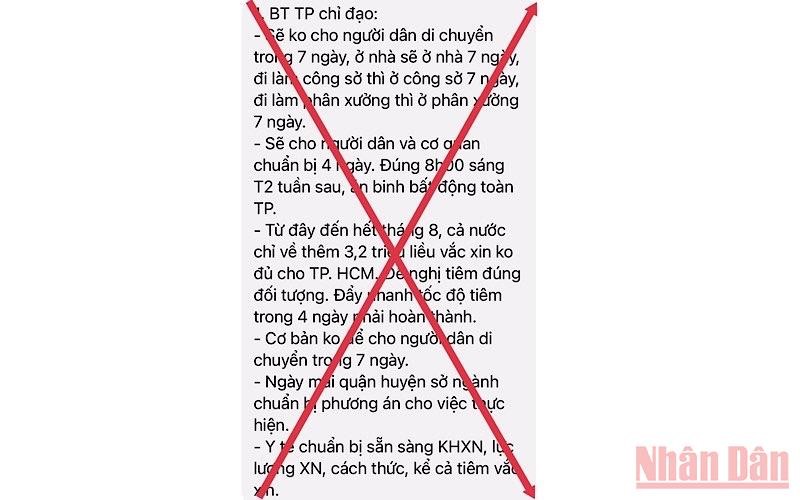 Tối 12/8, Ban Chỉ đạo phòng, chống dịch Covid-19 TP Hồ Chí Minh khẳng định: Thông tin đang lan truyền trên mạng xã hội về việc “không cho người dân di chuyển trong 7 ngày” là giả.